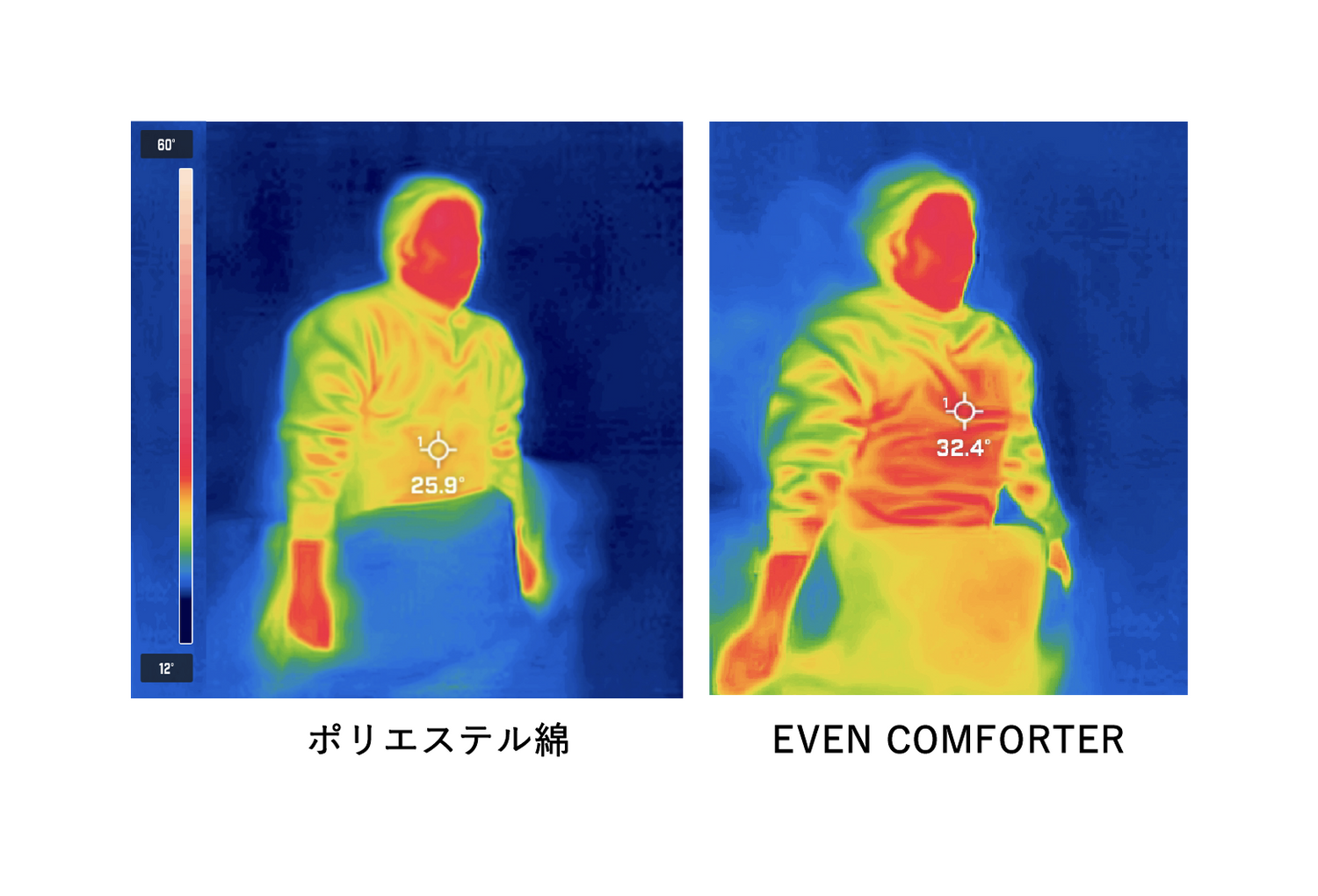 ※ポリエステル綿とEVEN COMFORTERを5分間使用した際の表面温度を計測