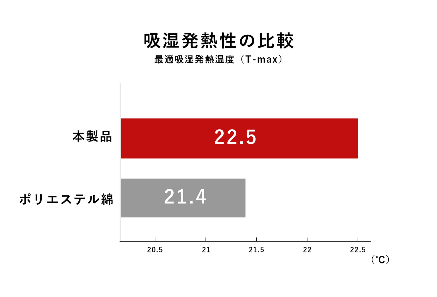 ポリエステル綿と比較した際の温度差が「1.1℃」吸湿発熱基準値「0.5℃」と比較すると驚異の220%の吸湿発熱力。