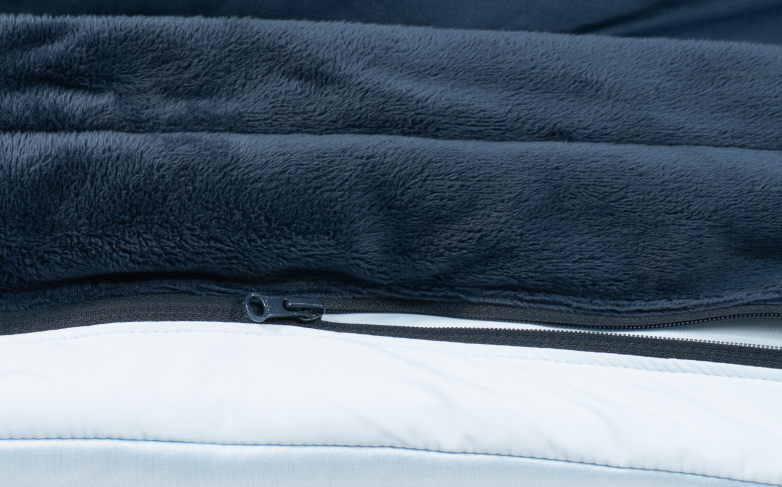 2つのレイヤーをファスナーで連結。体全体をやわらかく包み込み、心地よい暖かさを生み出します。布団を替えずに冬も快適に過ごせます。