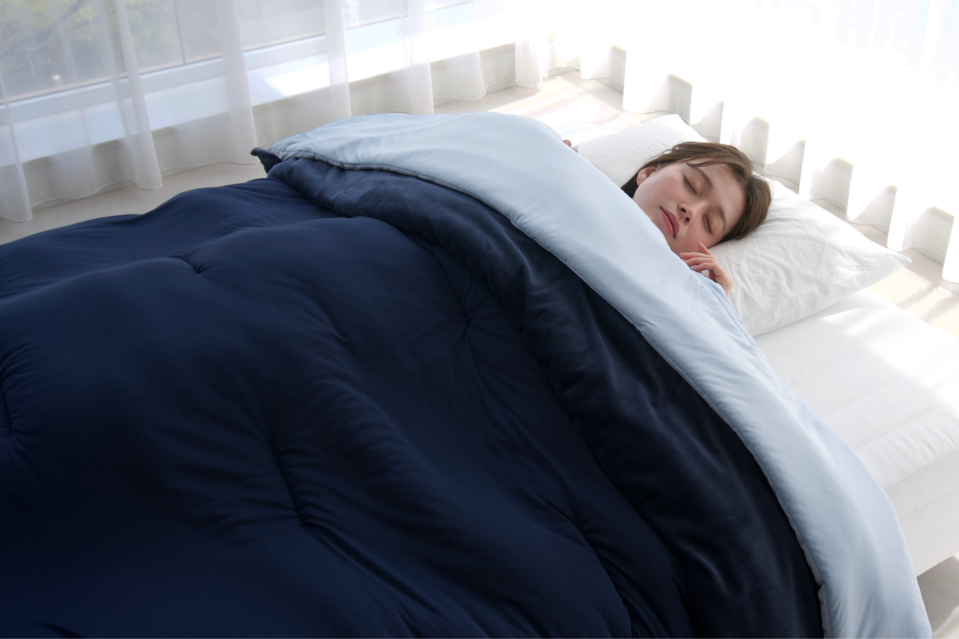 2つのレイヤーを組み合わせることで、気温や季節に合わせた最適な寝心地を実現。冬は暖かく、夏は涼しい。さらに季節の変わり目にも対応した、オールシーズン使える掛け布団。