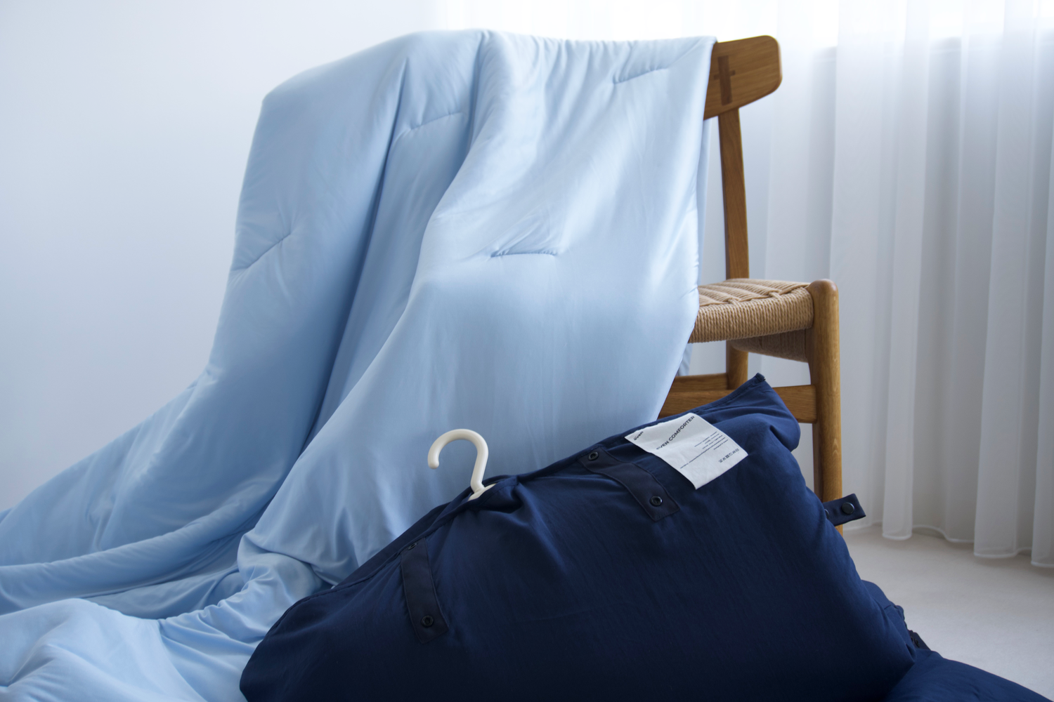 2枚のレイヤーを組み合わせて、季節ごとに快適を調整。ファスナーで簡単に着脱でき、オフシーズンはハンガー収納。手間なく整う、オールシーズン使える掛け布団。