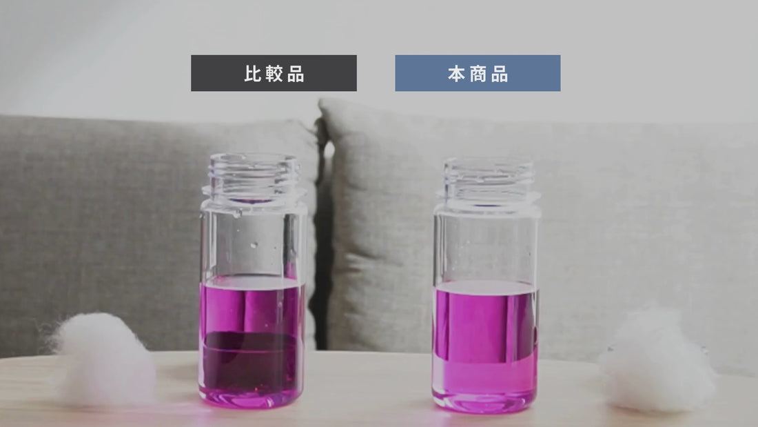 汗臭・加齢臭・尿臭・足臭のニオイの成分を排除。色付きのアンモニアで実験するとニオイの成分を瞬時に吸収。